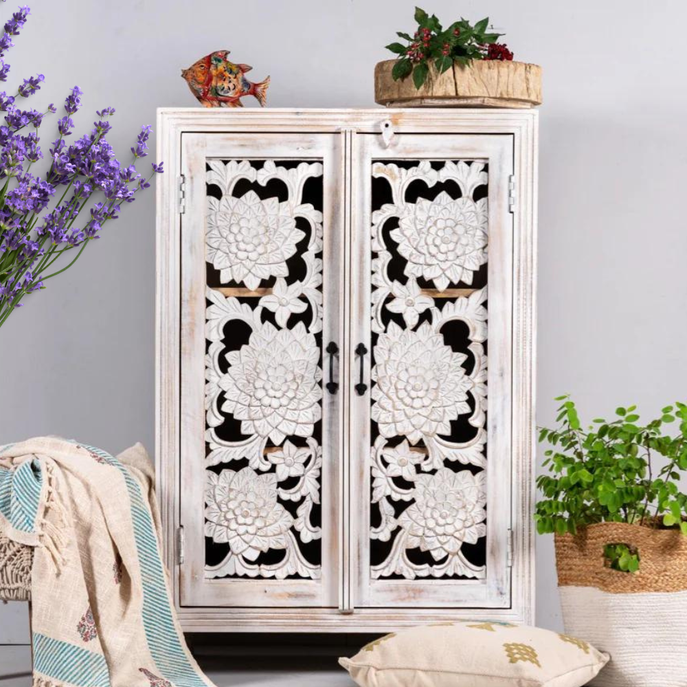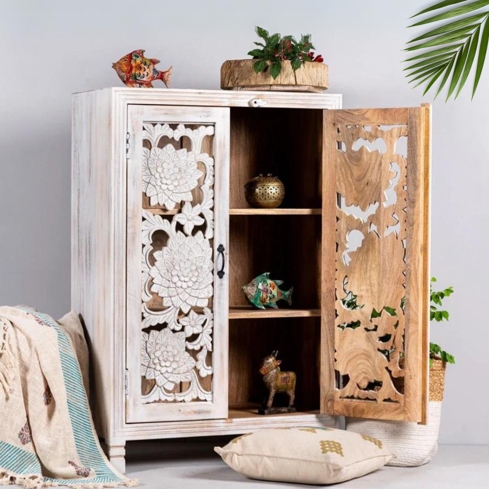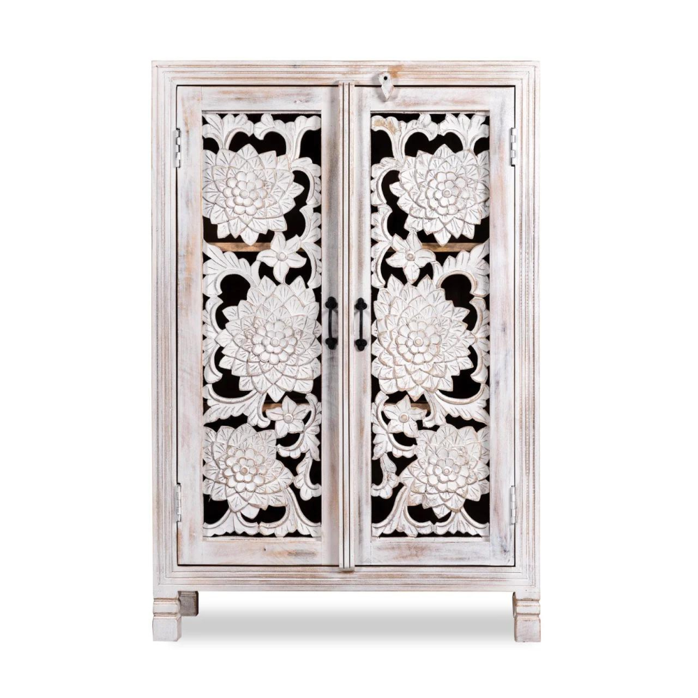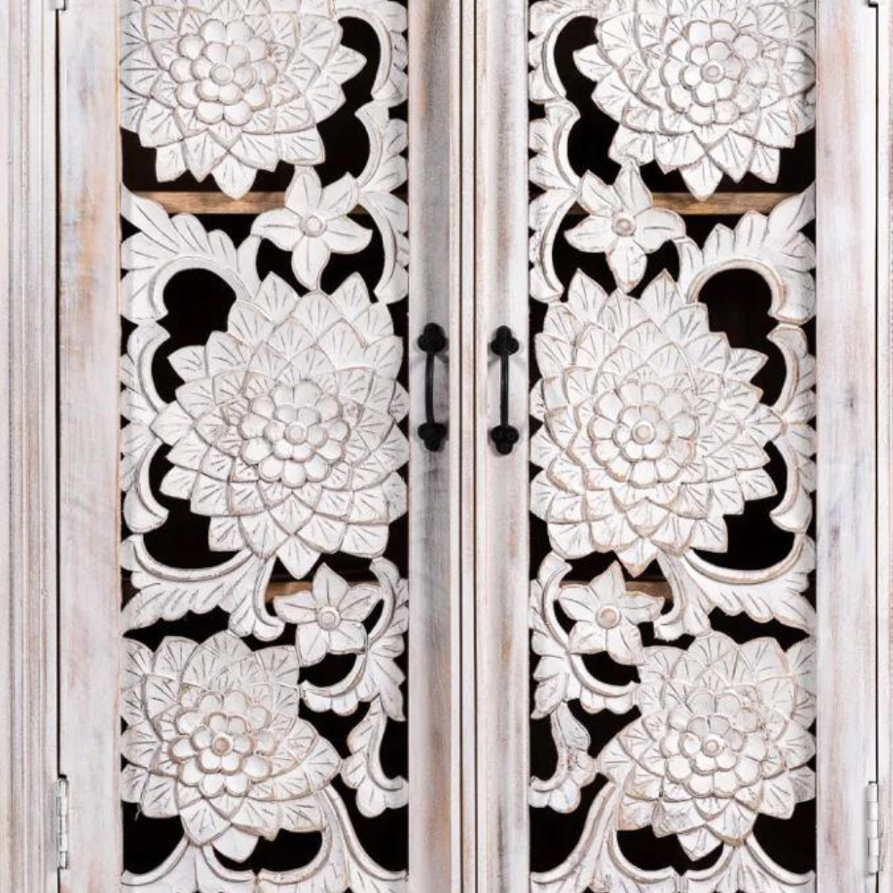 Our Samode cabinet is Mediterranean and will be an eye-catcher in your living room, bedroom, or bathroom. With its 3 large compartments, it offers a lot of storage space. The doors are richly decorated with floral handmade carvings.