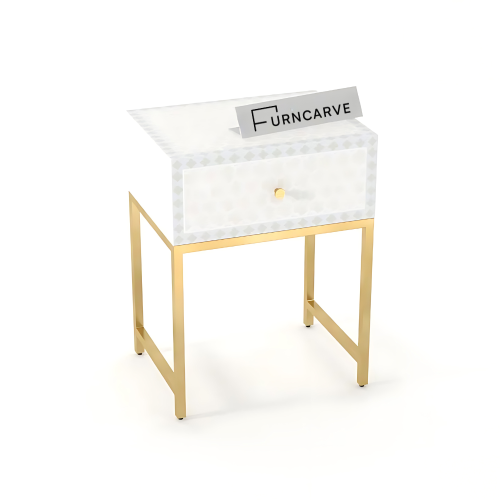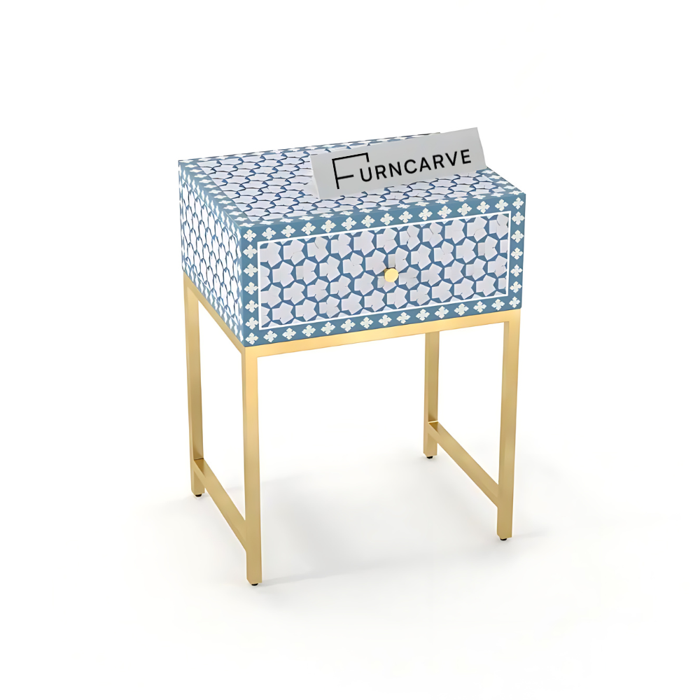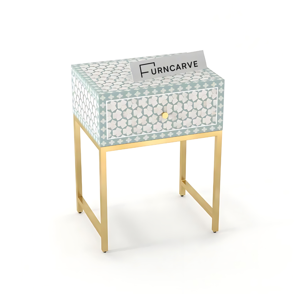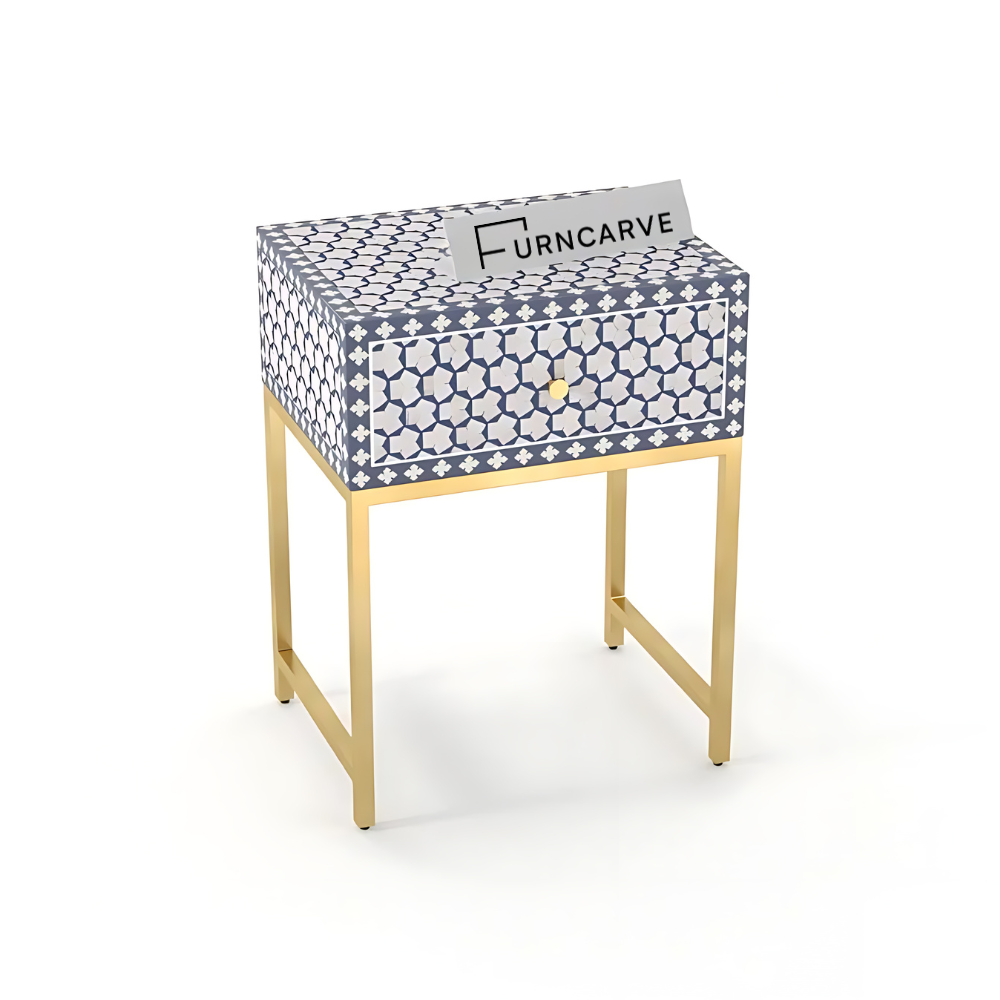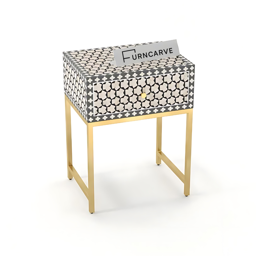 Bring the bone inlay trend into your bedroom with the Targua Bone Inlay Bedside Table, handcrafted by artisans in India using time-honored techniques. This bedside table would add glamour to any space with an intricate floral design, gold legs, and a handy drawer. It is a stunning piece and a work of art.