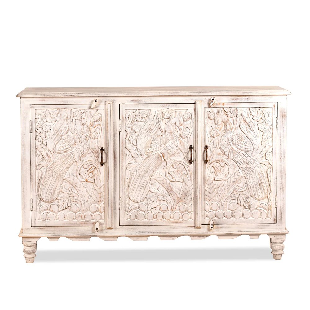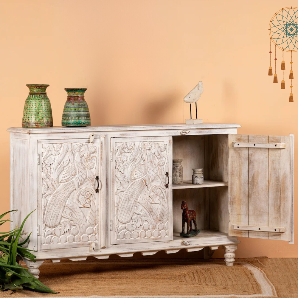 Introducing sideboard, a beautiful blend of art and utility. Its calming white-washed finish adds an elegant touch to your room. What makes it truly special are the intricate hand-carved peacock engravings, showcasing the craftsmanship of India. This sideboard not only offers ample storage but also serves as a captivating piece of art, bringing style and culture into your living space.