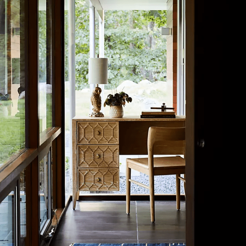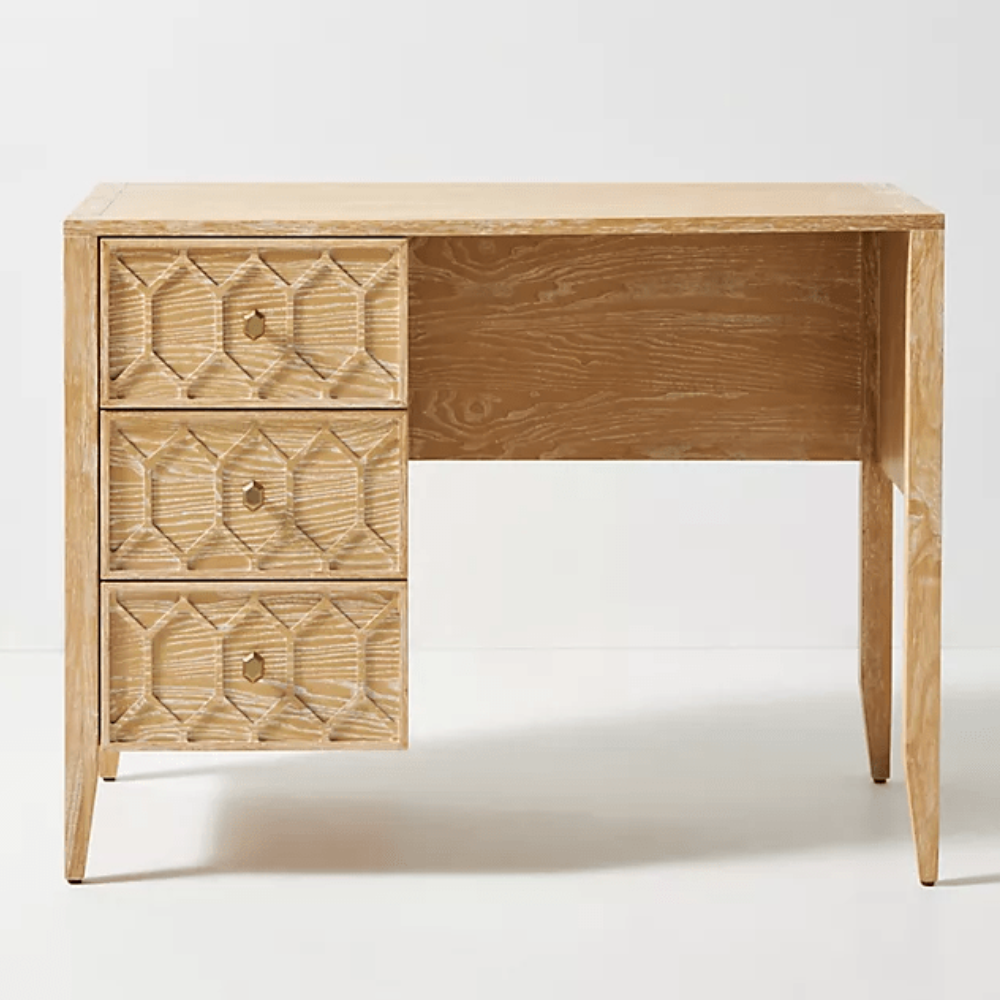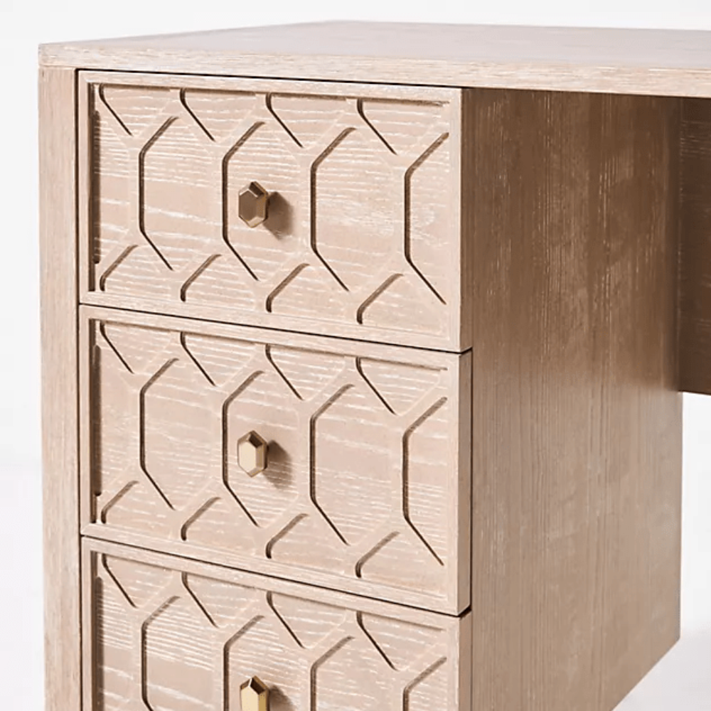 Like the garden trellises that inspired its design, our Textured Trellis collection invites a fresh perspective into your home. Complete with a raised motif on its ash wood facade and faceted brass pulls, this desk’s timeless style is found in both its details and classic silhouette.