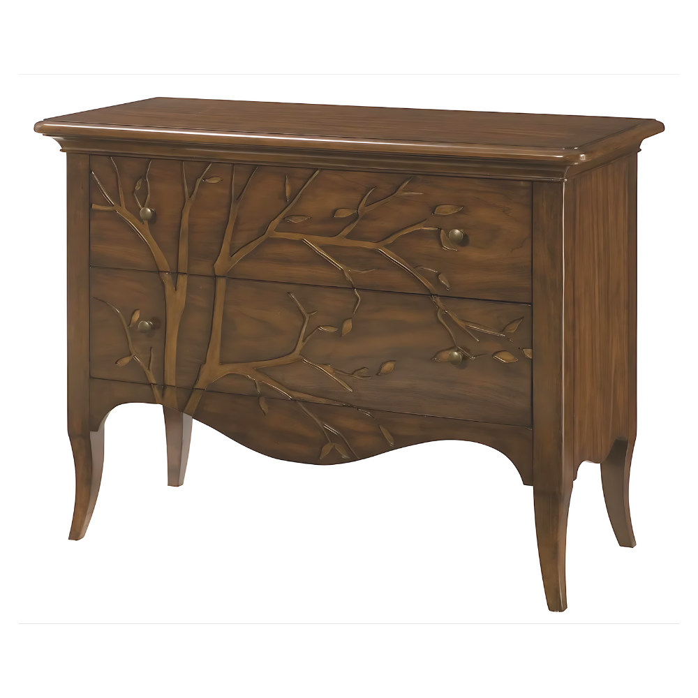 This Two Drawer Tree Design Front Chest of Drawers is a striking and detailed piece of furniture for your home. This Chest of Drawers includes simple features such as antique brassy knobs, curved apron base, and bowed, tapered legs. The elaborate tree carving on the drawer fronts draws attention and gives the space a warm, autumn-like feel. This breathtaking Chest of Drawers is a stylish addition to any space.