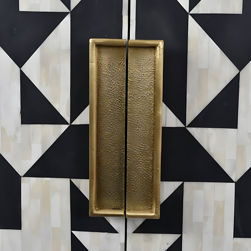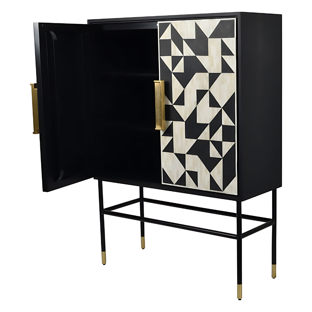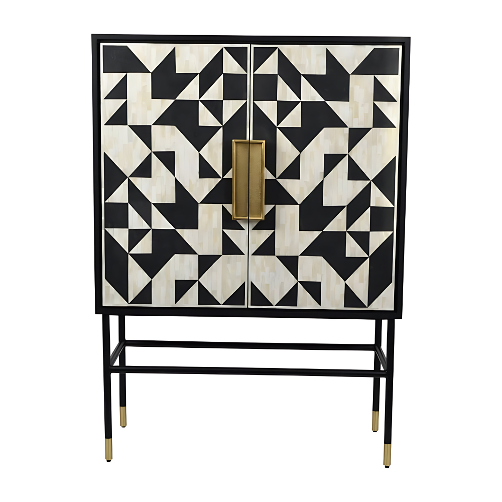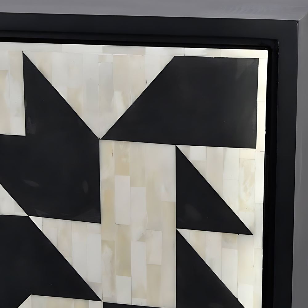 Make celebrations classic with this beautiful bone-inlay drinks cabinet that boasts an eye-catching monochrome geometric design in ivory and black.