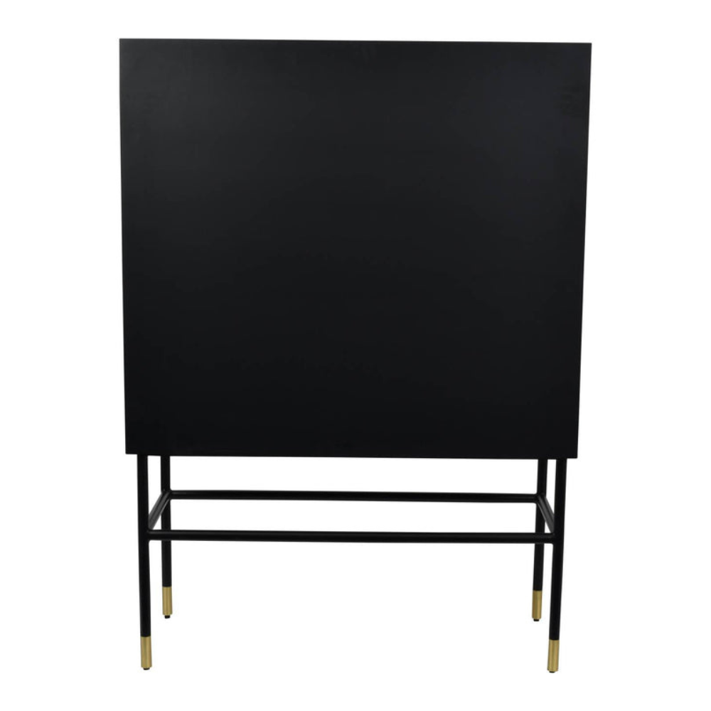 Drinks cabinets bring a touch of class to a space, and this piece is no exception. With an eye-catching monochromatic contrast between the ivory and black geometric patterning, the bone inlay design is striking from all angles. The cabinet contains a single shelf inside and sits atop black legs that have gold detail for added warmth.