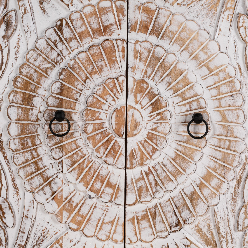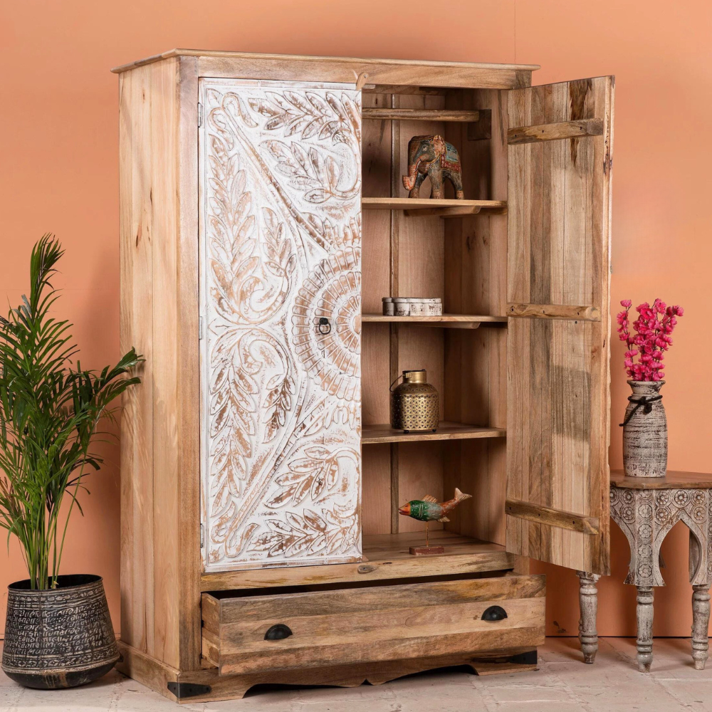 Experience the exquisite craftsmanship of the “Vandara” Indian handcrafted cupboard, a true masterpiece that effortlessly blends elegance and functionality. The grandeur of this piece is defined by its grand white-washed doors adorned with intricate hand-carved engravings, showcasing the skill and artistry of Indian artisans.