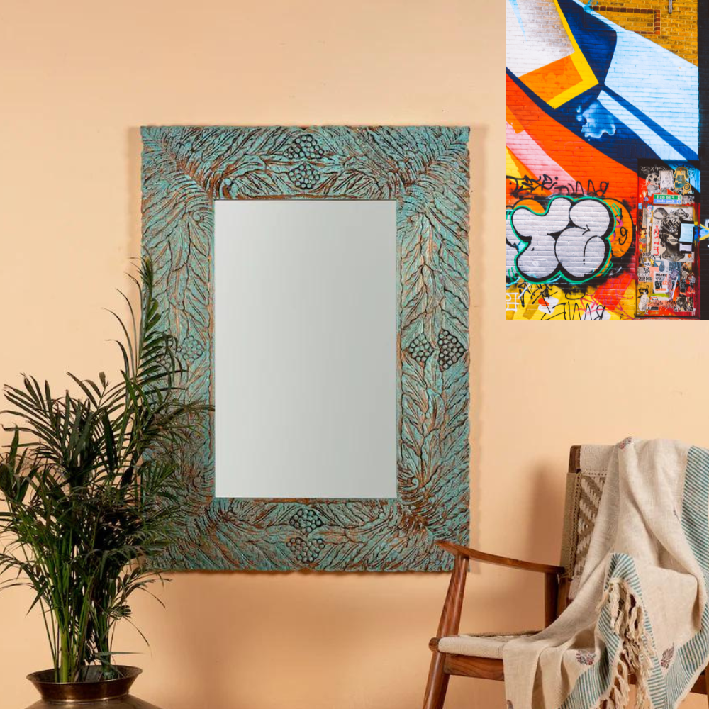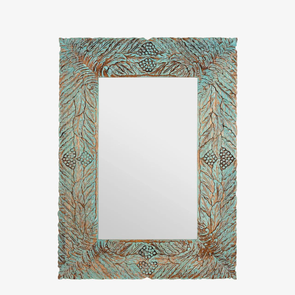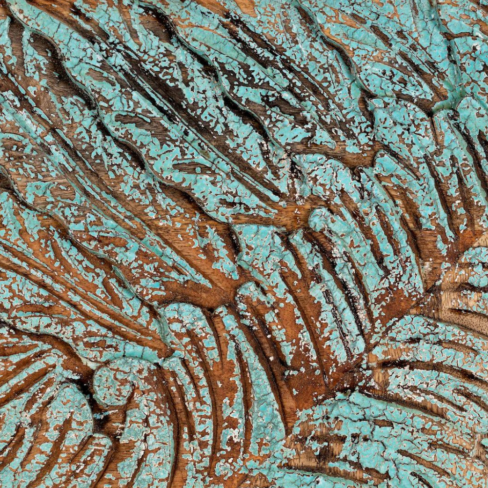 Introducing the Vintage Tropical Coconut Tree Leaves Wall Mirror, a stunning piece of Indian craftsmanship. This mirror comes in a beautiful turquoise & White Washed color and is adorned with intricate hand-carved engravings that highlight the skill of Indian artisans. This mirror adds a pop of color and a touch of Indian culture to your living space.